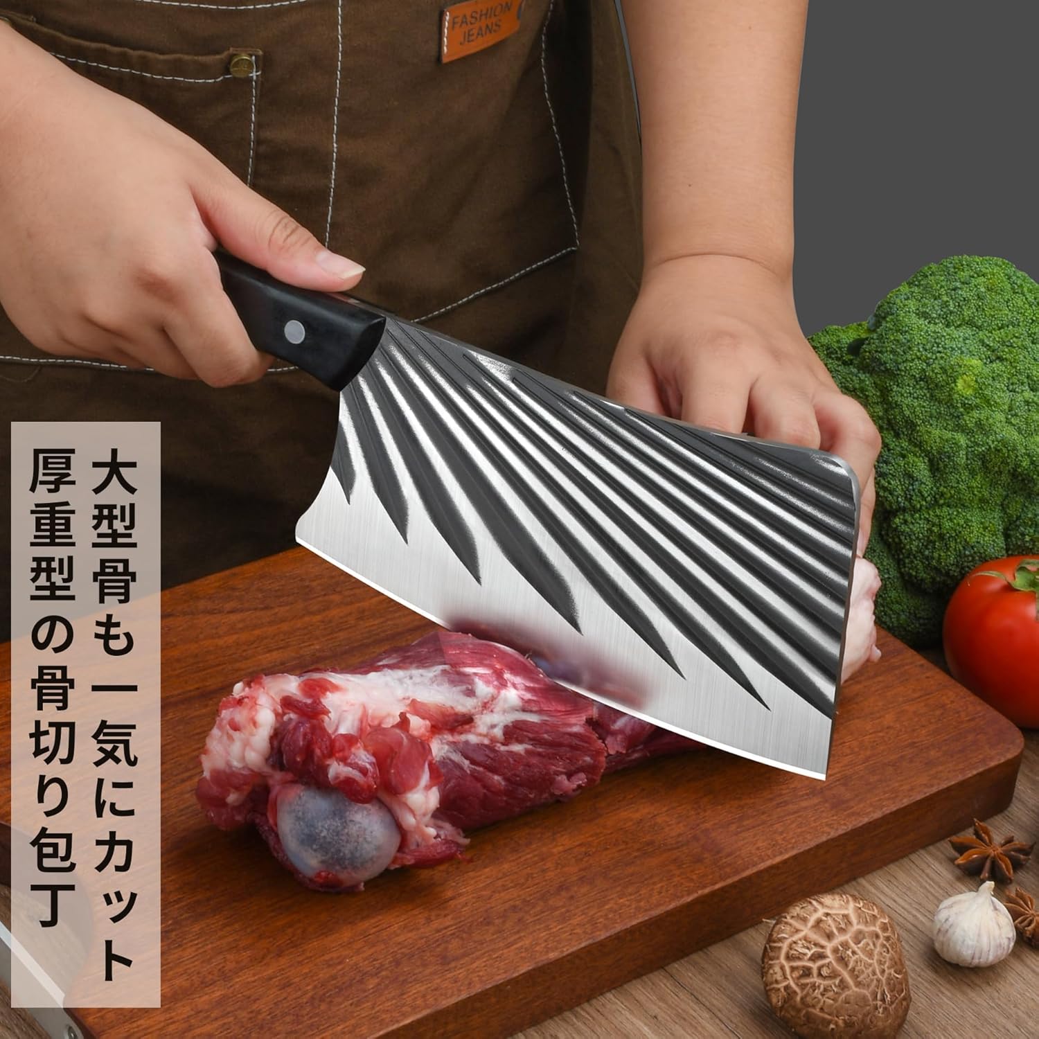 - 🔪 厚い刃: 骨や硬い部分を叩き切るのに適した設計。
